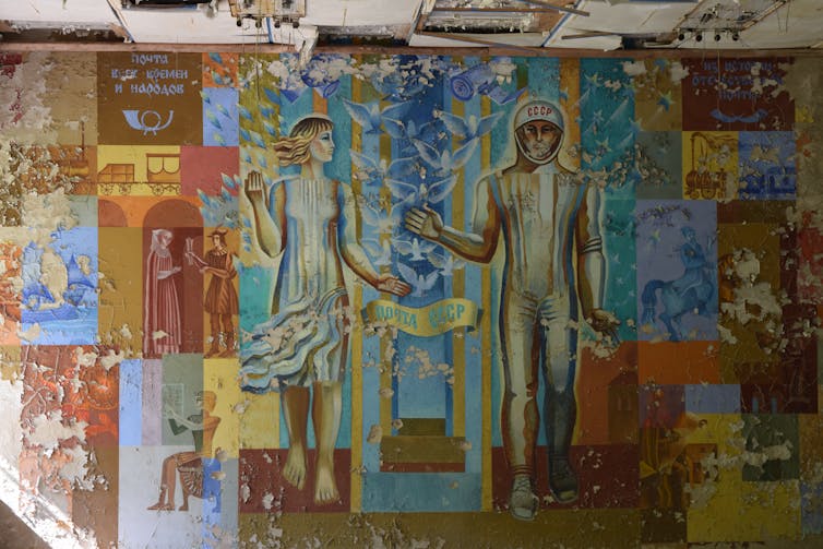 Così, a pochi chilometri da Pripyat, abbiamo trovato sul muro del centro di controllo della base militare segreta “Chernobyl-2” – il dispositivo ZATO (Zakrytoe amministrativo-territoriale obrazovanie, che letteralmente significa entità amministrativo-territoriale chiusa) completamente chiuso agli estranei, che ospitava alcune centinaia di soldati responsabili del funzionamento dell'antenna ricevente Duga 1, adibita al rilevamento dei missili intercontinentali lanciati dagli Stati Uniti -, Un murale colorato che rappresenta un cantiere nello spaziodove gli astronauti hanno sperimentato veicoli a propulsione autonoma Guerre stellari.